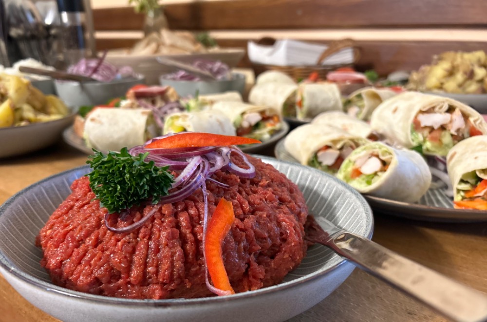 - Hovězí tatarák s opečeným česnekem a topinkami 30g/os