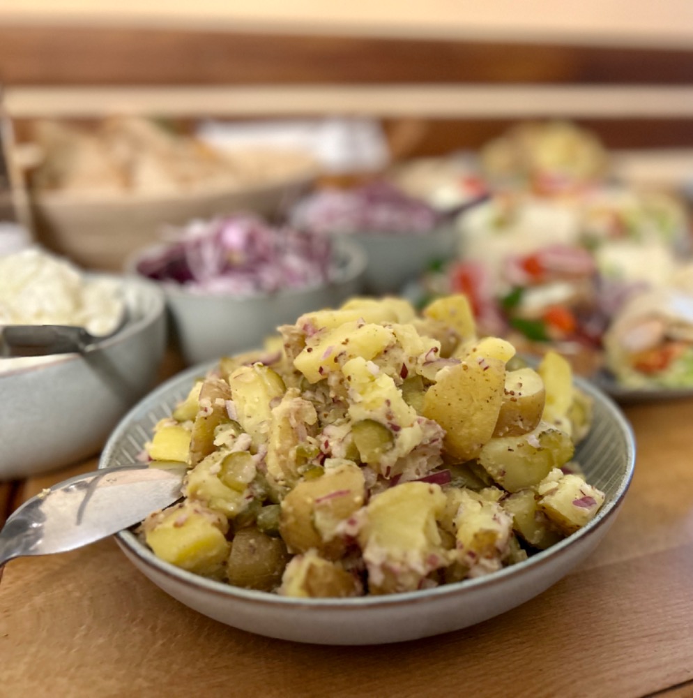 - Variace kuřecích a vepřových řízečků, vídeňsky salát, kyselé okurky 70g/os