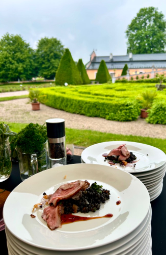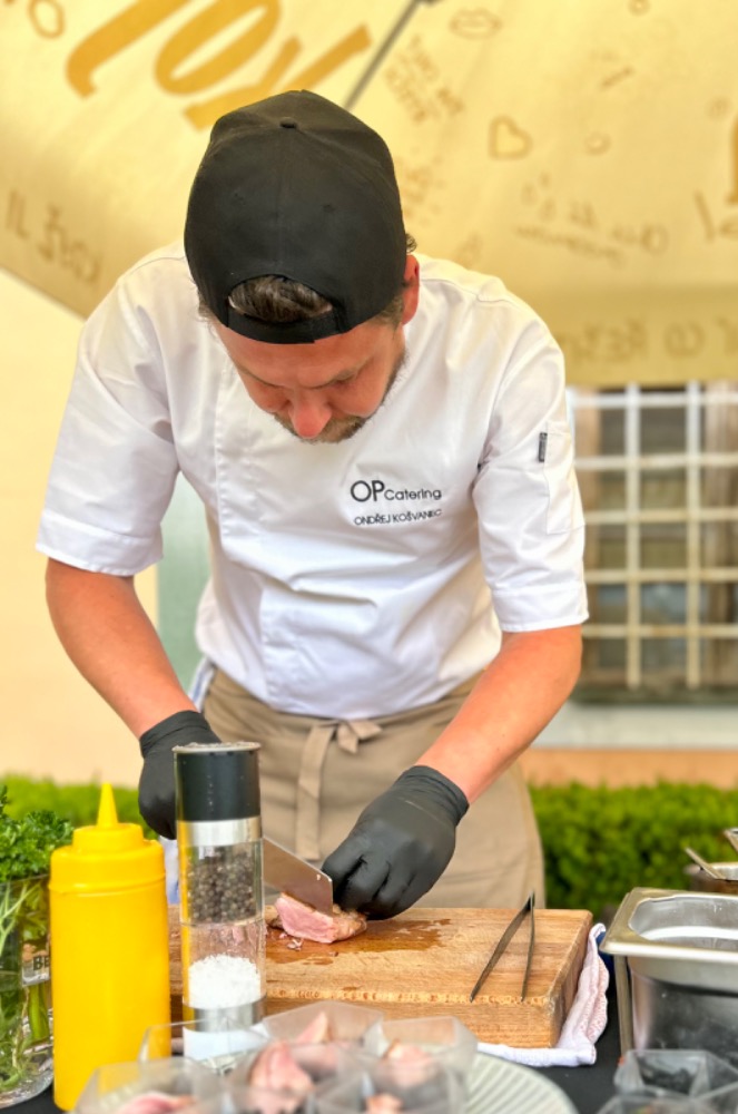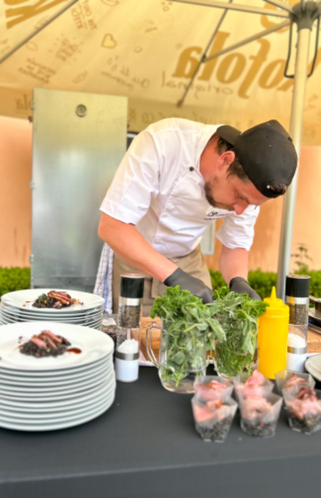 - Salát z černé čočky, stříbrné cibulky, pečená paprika, plátky za uzených kachních prsíček 45g/os