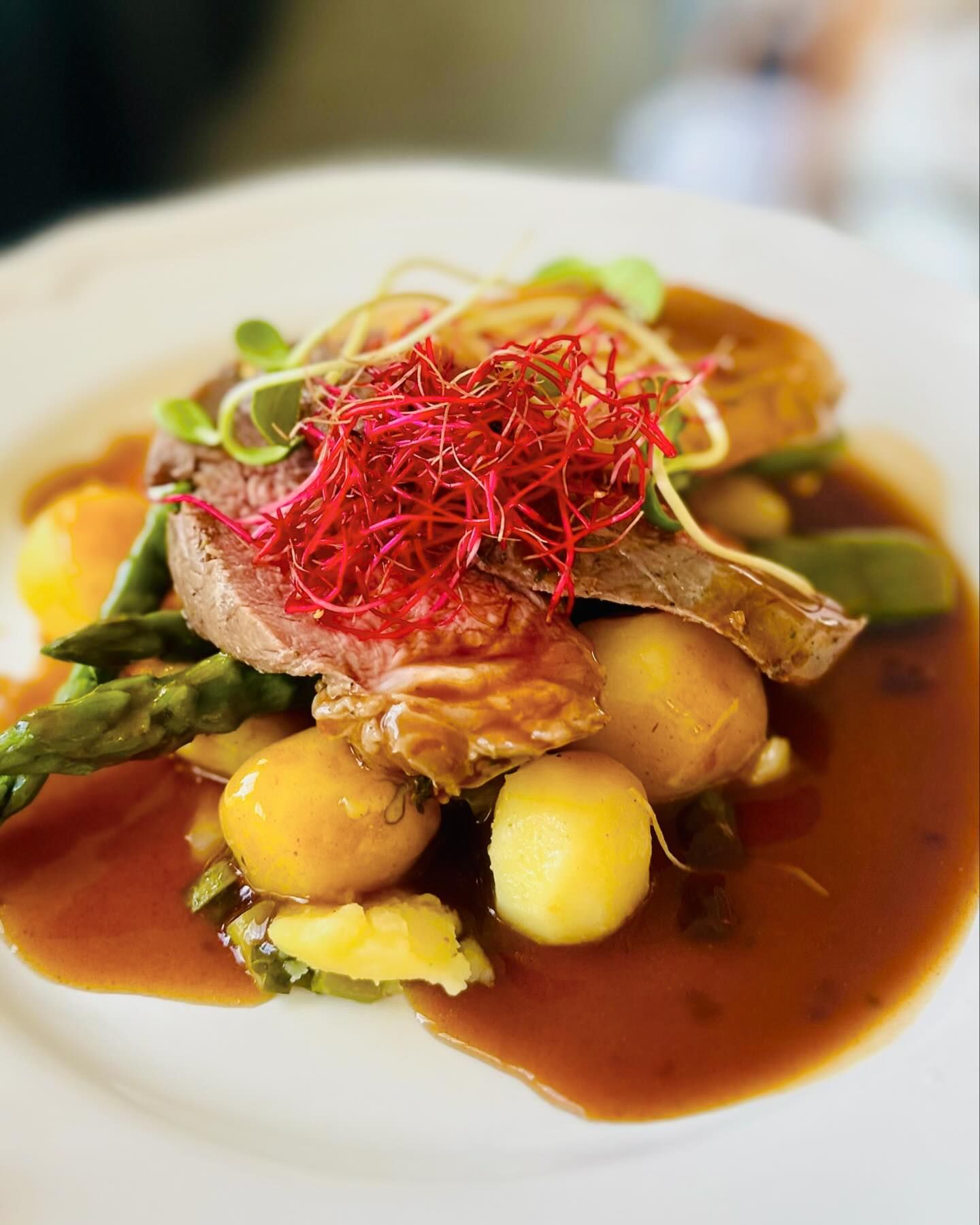 - Mix gril (kuřecí prsíčka,vepřová panenka,hovězí hrudí), zelený chřest, pečené mladé brambůrky s jarní cibulkou Marinovaný tempeh, zelený chřest, pečené mladé brambůrky s jarní cibulkou
