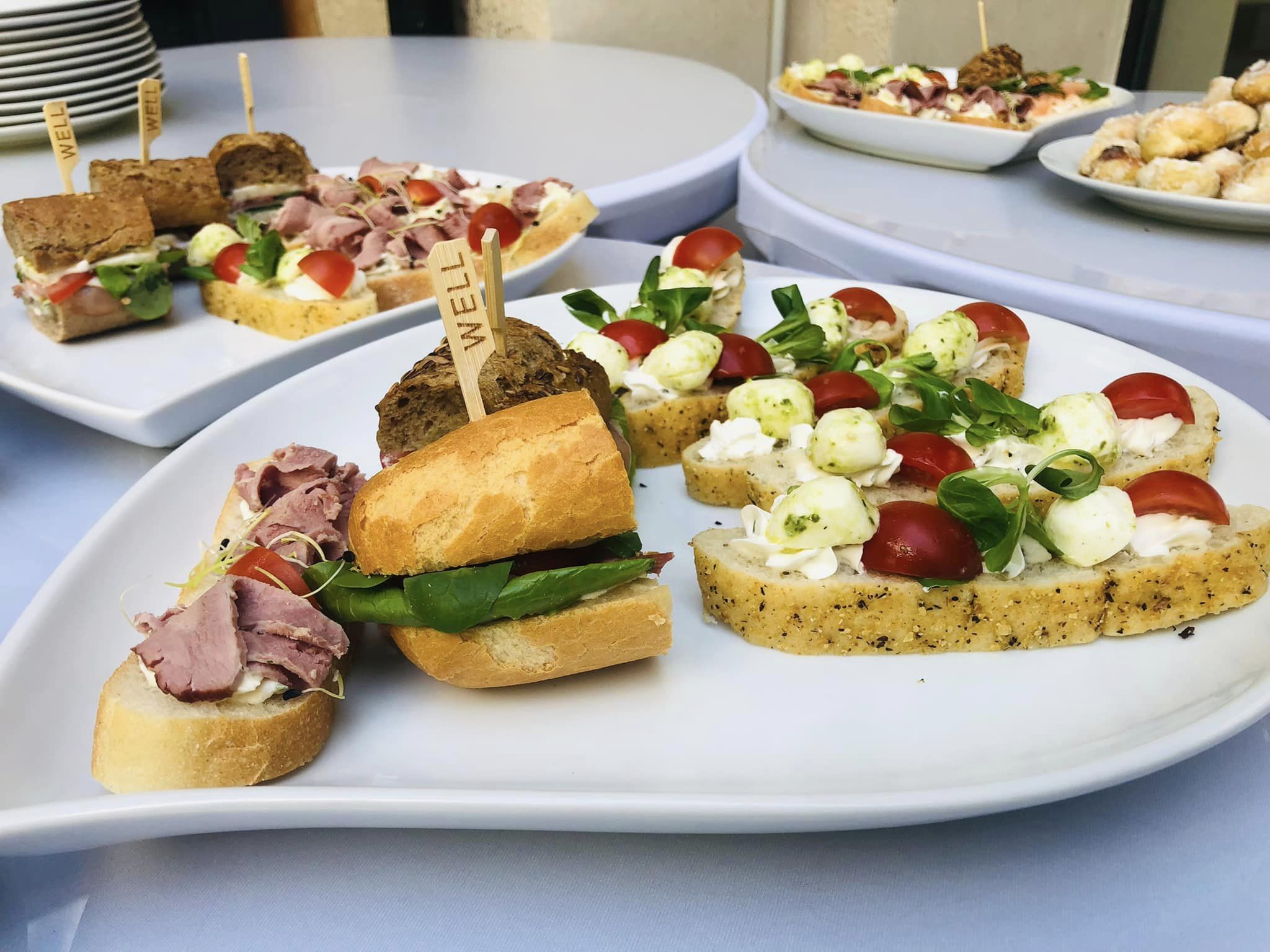 Špízy z cherry rajčat a třešňové mozzarelly, bazalkové pesto, olivová focaccia